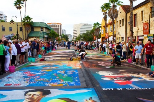 The indomitable Denise Kowal, volunteer head of the Sarasota Chalk Festival, plans to outdo herself again, promising that this year’s will be the biggest and best Chalk Festival yet. The Festival will run from October 28 to November 6, 2012. In recent years, this growing event has reached international acclaim, bringing artists from all over the world to our Gulf shores in search of pavement on which to create their wondrous chalk renderings. It became the first international street painting festival in 2010. In this fifth season, over 500 artists will participate, and the event will draw over 200,000 visitors, including 5,000 children. Not to mention the fact that this whole event is perfectly free!