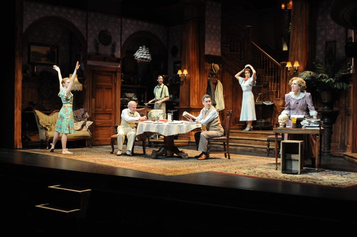 Long before the global financial meltdown, Occupy Wall Street, the 47 percent and the one percent, there were the Sycamores and the Kirbys, who had a lot to say about the role of money in our lives. You Can’t Take It With You, a charming and extremely funny play about star-crossed lovers, Alice Sycamore and Tony Kirby, is currently playing at the Asolo Repertory Theatre. This is the second production in the Asolo’s season called “The American Character,” following the wonderful staging of 1776 (see my review here).In this play, set toward the latter part of the Great Depression, the eccentric Sycamore clan lives on the Upper West Side of Manhattan, near Columbia University, and while away their days together doing whatever suits their fancy. Older sister Essie (Lindsey Tornquist) is a budding ballerina who can’t pirouette after eight years of lessons; her husband Ed (Joseph McGranaghan) loves to play the xylophone and print the menu for their nightly dinners of corn flakes and home-made candies; father Paul (David Breitbarth) enjoys reading Trostky and building fireworks in the basement; and mother Penny (Peggy Roeder) is an amateur playwright and painter obsessed with sex. The only two in the family who seem to have ventured below 103rd street are grandpa Martin Vanderhof and younger sister Alice.