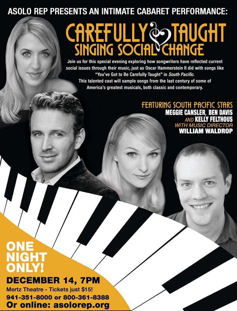 It was one of those rare nights in theater that can never be recaptured but which will stay with me forever. Carefully Taught: Singing Social Change was a cabaret evening at the Asolo Repertory Theatre unlike any other. Three of the South Pacific cast members, Ben Davis (Emile DeBeque), Kelly Felthous (Nellie Forbush), and Meggie Cansler (Ensign Dinah Murphy) brought the weight and depth of the Broadway canon to the Mertz stage taking us on a magical ride through our collective history. Music Director William Waldrop accompanied on the piano and chimed in for one song.