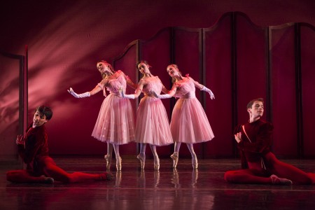 Yet “Changing Light” was only one part of the incredible line-up. The evening opener, “Valses nobles et sentimentales” was like a childhood dream – a gorgeous pink and red confection- a veritable pop-up valentine on stage. This was one of my favorite performances by Danielle Brown – who seemed born for her leading role in this piece – flying across the stage as light as air – partnered perfectly by Ricardo Rhodes. Another standout of this dazzling romantic Sir Frederick Ashton piece was Logan Learned, whose slight knowing smile combined with his absolute precision on stage, was a joy to watch. Learned was airborne for much of his time on stage framed by the delicate coterie of female dancers. This dazzling piece in the hands of a less capable corps of dancers could easily veer into a sugary overload; but the company pulled it off to great effect. This was an ideal pre-Valentine’s day number setting the mood for romance and joy.