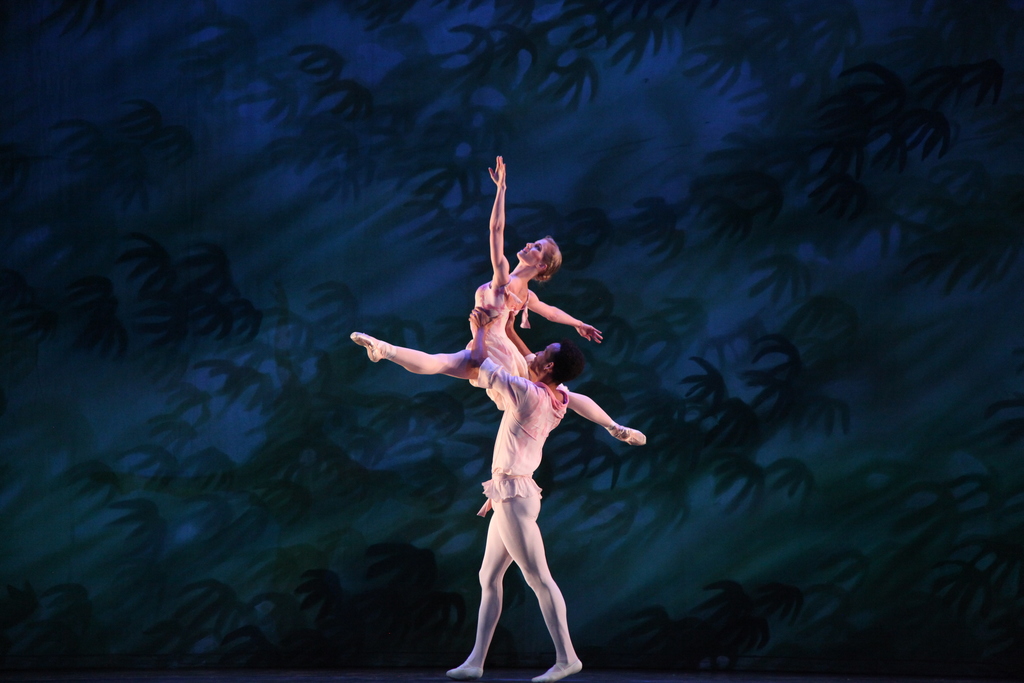 Next up was “The Leaves are Fading,” a wonderful showcase for the principals and an introduction to some newer faces in the corps de ballet. Victoria Hulland brought subtlety and nuance to the role of the reflective woman reminiscing about her life and her loves in the garden. Katelyn May and Ricardo Rhodes formed the strongest pairing of the piece, and every scene that featured the two was positively riveting. May rounds out each movement with precision and poise, and Rhodes is truly the most generous and careful partner in every pas de deux. “Marguerite and Armand” later in the evening showed that Hulland and Ricardo Graziano may be the most passionate pairing, but May and Rhodes have a quiet grace that should align them as the next important duo for the company to develop.