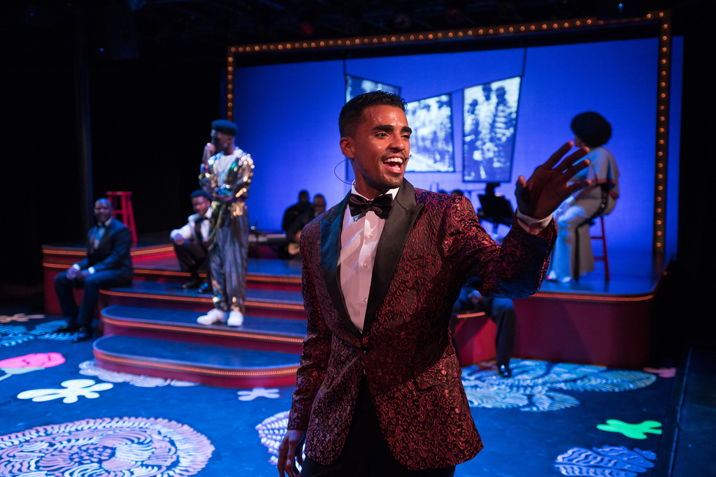 In the meantime, the latest revue features a rather flimsy premise but, for the most part, delivers with hit after hit performed by the fabulous five “soul men.” When the show begins, a new performer named Breezy Weezy (Derrick Gobourne, Jr.) who has a Fresh Prince of Bel Air vibe in gold lame and chains makes his debut on the show of DJ Diamond (Ariel Blue). Diamond finds his arrogance off-putting and decides to school him in the history of soul music so he gains an appreciation for the creative musicians who preceded him. She summons the stellar cast, including fan-favorite Michael Mendez and newcomer Sheldon Rhoden as well as Leon Pitts II, Henry Washington and Raleigh Mosley II.