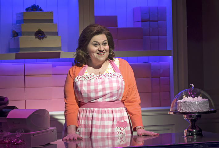 Enter the luminous Jen, played by Asolo newcomer Amanda Fallon Smith, who made a splash earlier this season as Abigail Williams in “The Crucible.” Jen grew up in Winston-Salem, North Carolina where “The Cake” is set, and Della is her late mother’s best friend. Jen struggles to introduce Della to her partner Macy, because she longs for acceptance among the Bible-belt community where she was raised. Amid Jen’s raves about her baking, Della manages to shuffle the brides away without an order for Jen’s dream wedding cake.