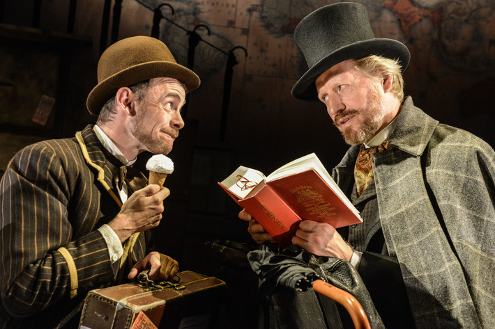 Phileas Fogg (Andrew Pollard), an eccentric Englishman, wagers an extraordinary bet with his small coterie of friends that he can traverse the world in eighty days. Pollard’s fastidious yet calm, gentle demeanor and his passion for schedules synergizes with the outrageous and kind-spirited Passepartout (Michael Hugo), his French valet. The two set off on a whirlwind adventure requiring precision timing to ensure that they return at exactly 9pm eighty days after they depart.