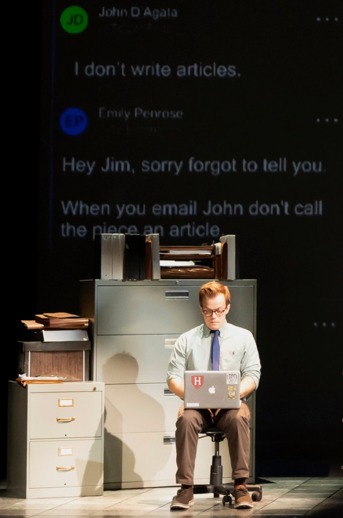 Arnold, who most recently graced the Asolo stage as Regina in “The Little Foxes,” gives a fantastic spitfire take on Emily, the editor who falls in love with the aforementioned essay for which she is ready to risk her career. Weygandt makes an unforgettable entrance as the quirky author, John, who plays with facts for their lyricism and their service to the greater story. Speedy, a recent Harvard grad himself, has a very apt surname. He was tremendous as Jim, a Harvard-educated intern, who worships at the altar of facts themselves.